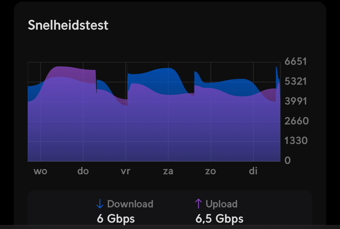 Het 5Gbit/s-abonnement is het snelste internetabonnement van de grote glasvezelproviders. KPN introduceert deze maand een 4Gbit/s-abonnement dat 67,50 euro moet kosten. De genoemde snelheden in dit artikel zijn symmetrisch. Op de glasvezelnetwerken van KPN, ODF en Delta zijn snelheden tot 8Gbit/s mogelijk, op termijn moeten ook snelheden tot 20Gbit/s mogelijk zijn.