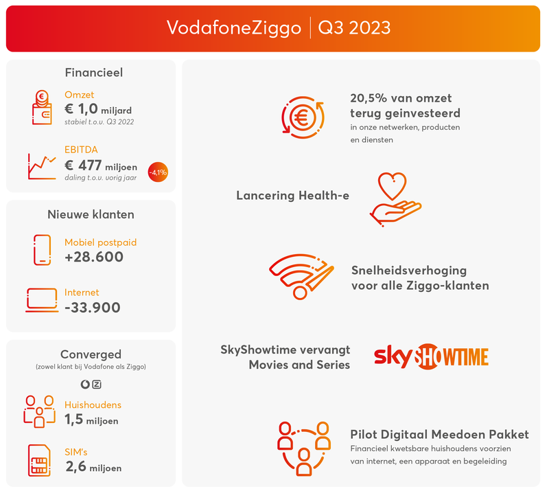 In het derde kwartaal van 2023 behaalde VodafoneZiggo een omzet van net iets meer dan een miljard euro, wat bijna exact overeenkomt met de omzet die in hetzelfde kwartaal van 2022 geboekt werd, zo blijkt uit de kwartaalcijfers. Deze omzet werd iets meer dan vorig jaar behaald met abonnementen voor consumenten, wat de lagere omzet uit b2b-abonnementen compenseert.