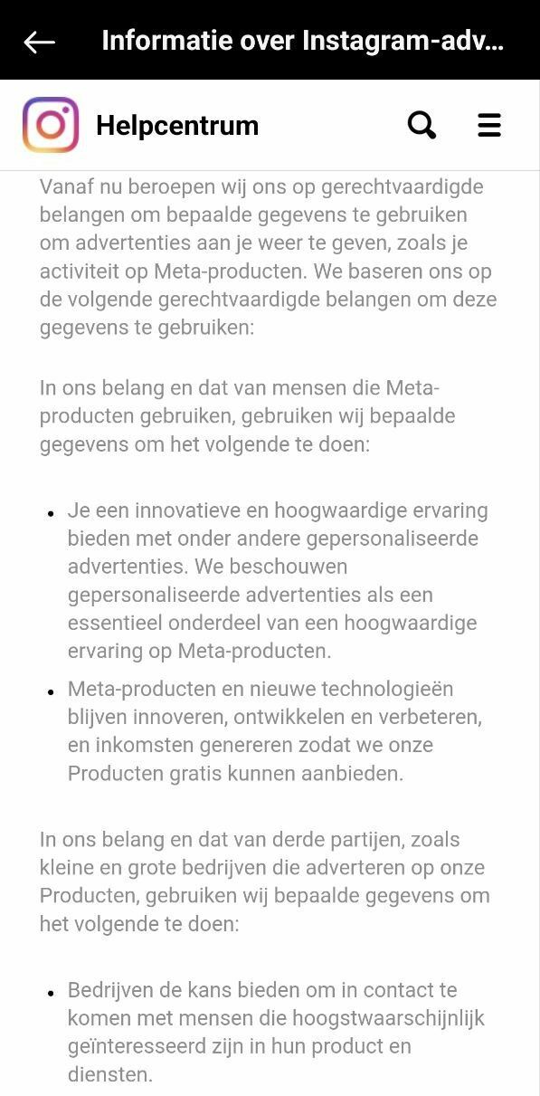 Meta is het daar uiteraard niet mee eens. Daarvoor hoef je niet ver te zoeken. Als je in Instagram bij een advertentie klikt op 'informatie over Instagram-advertenties', kom je terecht op een pagina waarop het bedrijf toelicht waarom het vindt dat advertenties op basis van tracking wel kunnen. "We beschouwen gepersonaliseerde advertenties als een essentieel onderdeel van een hoogwaardige ervaring op Meta-producten. Meta-producten en nieuwe technologieën blijven innoveren, ontwikkelen en verbeteren, en inkomsten genereren zodat we onze producten gratis kunnen aanbieden. In ons belang en dat van derde partijen, zoals kleine en grote bedrijven die adverteren op onze producten, gebruiken wij bepaalde gegevens om bedrijven de kans te bieden om in contact te komen met mensen die hoogstwaarschijnlijk geïnteresseerd zijn in hun product en diensten."