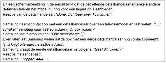 Volgens de Autoriteit Consument & Markt vonden de prijsbeïnvloedingen plaats van 2013 tot en met 2018. Samsung monitorde hierbij met webcrawlers de consumentenprijzen van tv's en gaf 'prijsinstructies' als tv's te goedkoop werden aangeboden. Webwinkels namen ook contact op met Samsung als bleek dat een concurrerende webwinkel tv's naar hun mening te goedkoop aanbood. "Daardoor hebben consumenten niet ten volle kunnen profiteren van de prijsconcurrentie tussen de detailhandelaren", schrijft de ACM. Samsung kan nog in hoger beroep gaan bij het College van Beroep voor het bedrijfsleven.