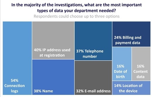 Europese opsporingsdiensten vinden connectielogs en IP-adressen de belangrijkste soorten gegevens bij onderzoeken naar criminele activiteiten. Locatiegegevens en betalingsdata zijn juist niet zo belangrijk voor onderzoeken.