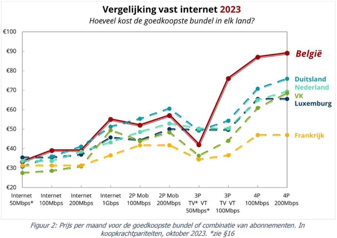 Op het vlak van vast internet is België 'opmerkelijk duurder' dan Frankrijk en het Verenigd Koninkrijk, met de kanttekening dat die twee landen veruit de goedkoopste vastinternetdiensten aanbieden. België is wel relatief goedkoop als het gaat om kleine bundels, voornamelijk door een Scarlet-aanbod met 30 tv-zenders, een vastinternetsnelheid van 50Mbit/s en vaste telefonie. Ook hier geldt dat naarmate de behoefte van de klant groter worden, Belgen relatief gezien steeds meer gaan betalen in vergelijking met andere landen.