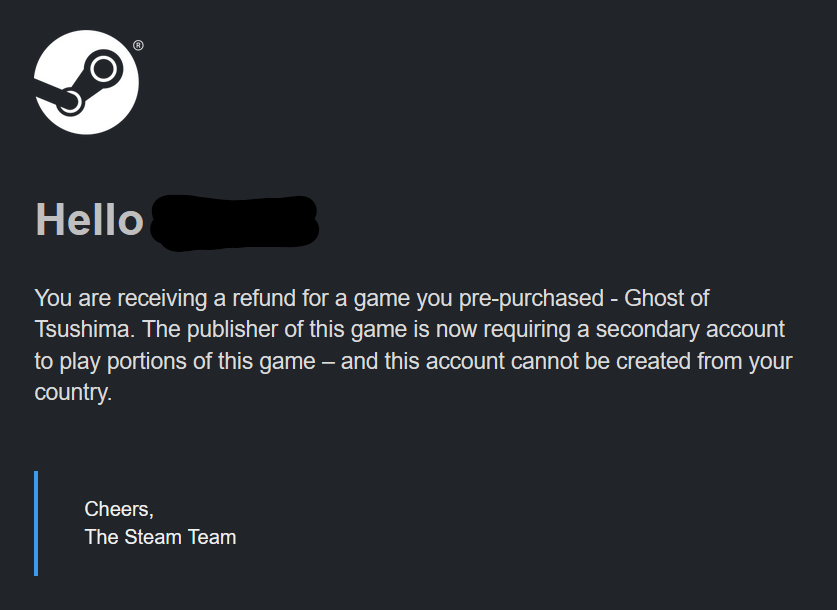 Verschillende spelers melden dat zowel Steam, Epic als Green Man Gaming hun preorders automatisch hebben terugbetaald omdat ze in een land wonen waarin het officieel niet mogelijk is om een PSN-account aan te maken, zo schrijft Eurogamer. Het gaat om spelers in meer dan 170 landen, voornamelijk in Afrika, Latijns-Amerika en Oost-Europa. Ghost of Tsushima was daar enige tijd te preorderen, maar vrijdag werd het spel in deze landen ineens uit de online winkels gehaald. Gebruikers in niet-PSN-landen die de game al hadden voorbesteld, krijgen nu dus ook hun geld terug.