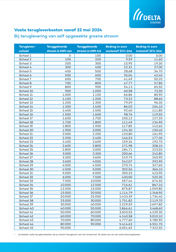 De terugleverkosten zijn vooraf bepaald en daarvoor hanteert Delta Energie een schalensysteem. De eerste 100kWh, ofwel schaal 1, kost niets extra. Bij een teruglevering van 100 tot 200kWh op jaarbasis, wat schaal 2 is, betaalt een klant 11,60 euro inclusief btw. Delta benadrukt dat de betreffende kosten volledig los staan van de salderingsregeling en eventuele netto terugleververgoedingen.