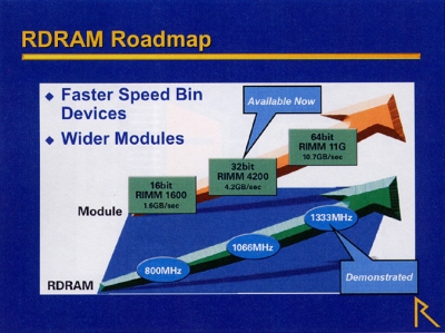 Op de site van VR-Zone vinden we de roadmap van Rambus terug, met een demonstratie van de opvolger van RDRAM, Yellowstone. Allereerst vinden we op de roadmap terug dat het bedrijf al een test van 1333MHz RDRAM geheugen heeft uitgevoerd. Dit levert Rimm 11G op, omdat de potentiële geheugenbandbreedte van het geheugen 10,7GB/s bedraagt.