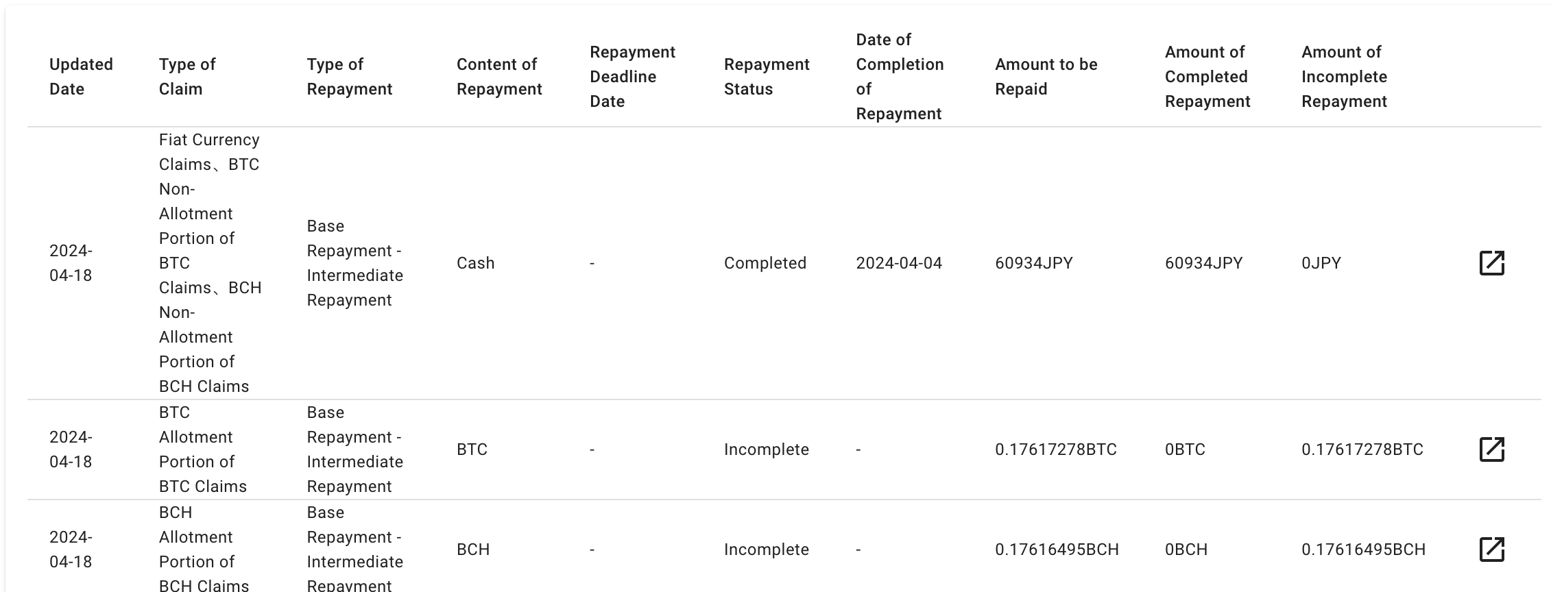 Mt. Gox schrijft in een brief dat het begonnen is met het uitbetalen van cryptovaluta aan slachtoffers van het faillissement. Dat blijkt ook uit verschillende posts op Reddit. Gebruikers zeggen daar dat ze geld hebben ontvangen van Mt. Gox. Ook op websites die de wallets van Mt. Gox in de gaten houden blijkt dat er inderdaad munten worden verplaatst naar nieuwe wallets van gebruikers.