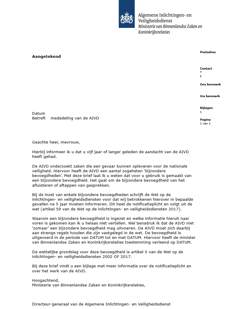 Het aantal mensen naar wie de AIVD onderzoek doet, ligt veel hoger, zegt minister Brekelmans van Justitie. "Slechts in een klein percentage van de gevallen kan er een notificatieverslag worden uitgebracht." De AIVD stuurt de melding, die wettelijk verplicht is, alleen als die de werking van de eigen of een andere dienst niet onthult, als ze de verhouding met andere landen niet schaadt en als de persoon te vinden is.