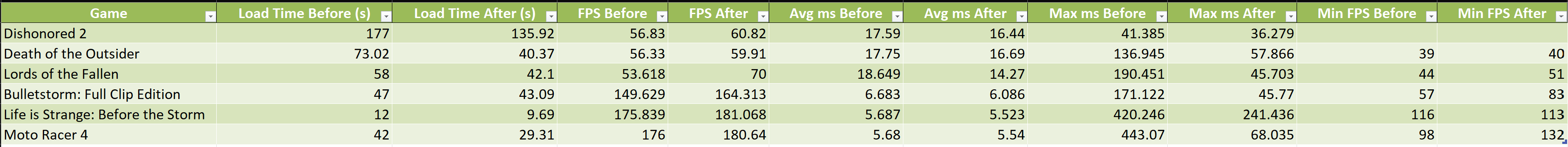 De resultaten van verschillende tests tonen aan dat het verwijderen van Denuvo over het algemeen leidt tot betere prestaties, zowel in kortere laadtijden als hogere frames per seconde. Zo verminderde Lords of the Fallen zijn laadtijd van 58 naar 42,1 seconden, met een verbetering in de gemiddelde FPS van 53,6 naar 70 FPS en een hogere minimale FPS van 44 naar 51. In Bulletstorm: Full Clip Edition ging de minimale FPS van 57 naar 83, met een gemiddelde FPS-toename van 149,6 naar 164,3. Daarnaast daalden de maximale frametijden aanzienlijk, zoals bij Moto Racer 4, waar de maximale tijd van 443 ms naar 68 ms ging. Hoewel de verbeteringen per game verschillen, zijn de positieve effecten op zowel laadtijd als prestaties consistent, vooral in termen van vloeiendere gameplay en snellere laadtijden.