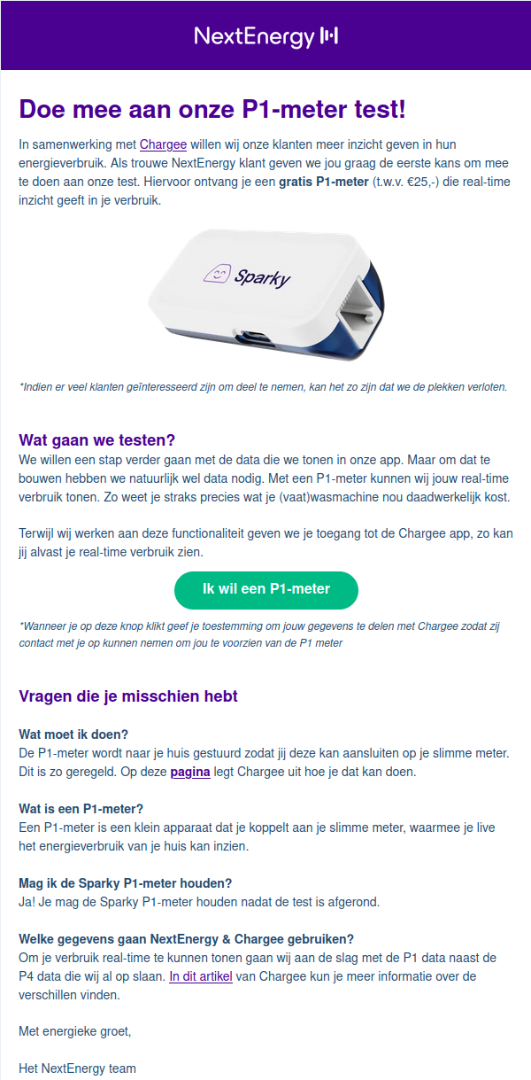 NextEnergy schrijft dat in een e-mail aan gebruikers, die Tweakers heeft ingezien. De energieleverancier gaat gebruikers tijdens een proef een Sparky-energiemeter geven. Dat is een dongel van Chargee, een dienst waarmee gebruikers data van hun slimme meter kunnen uitlezen. De Sparky moet daarom ook gebruikt worden in combinatie met Chargee. Gebruikers moeten de Sparky met een RJ12-connector aansluiten op hun slimme meter. Via die P1-poort kunnen eindgebruikers zelf hun energiegebruik uitlezen. Die standaard zit verplicht op Nederlandse slimme meters, al bleek enkele jaren geleden uit onderzoek dat maar weinig mensen dat daadwerkelijk gebruiken. Gebruikers mogen de Sparky houden na afloop van het experiment.