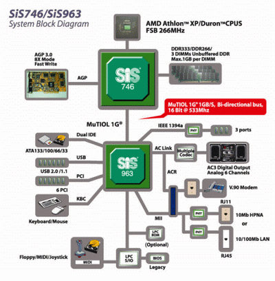 OCWorkbench heeft de specificaties van de SiS 746 chipset online gezet. Deze nieuwe chipset voor AMD Socket A processors bestaat uit twee delen die via SiS MuTIOL technologie met elkaar communiceren. Deze technologie is in staat om de data tussen de north- en southbridge met maximaal 1,2GB per seconde te versturen. De chipset biedt in combinatie met de SiS 963 southbridge ondersteuning voor onder meer AGP8x, maximaal zes USB 2.0 poorten, zes keer PCI, zes kanaals audio en vier keer ATA133.