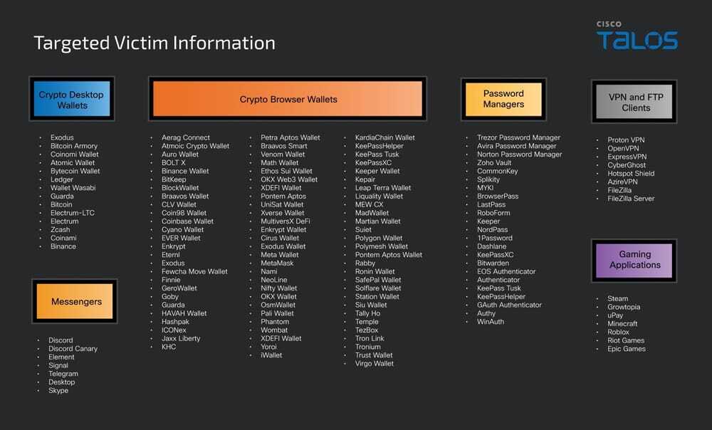 Na het kraken van het wachtwoord steelt PXA niet alleen beschermde data zoals inlog- en betaalgegevens, maar ook cookies. Daarnaast stelt Cisco Talos dat de malware specifiek zoekt naar gegevens van cryptowallets, wachtwoordmanagers en diensten zoals Steam, Epic Games, Discord, Signal en Telegram.