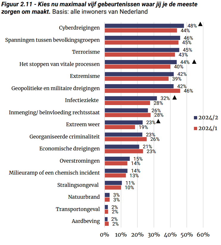 In de najaarsmeting van de Risico- en Crisisbarometer 2024 geeft 48 procent van de Nederlandse inwoners aan zich het meeste zorgen te maken om cyberdreigingen. Deze 'significante stijging' van vier procentpunt ten opzichte van de voorjaarsmeting zorgt ervoor dat deze gebeurtenis op nummer een staat.