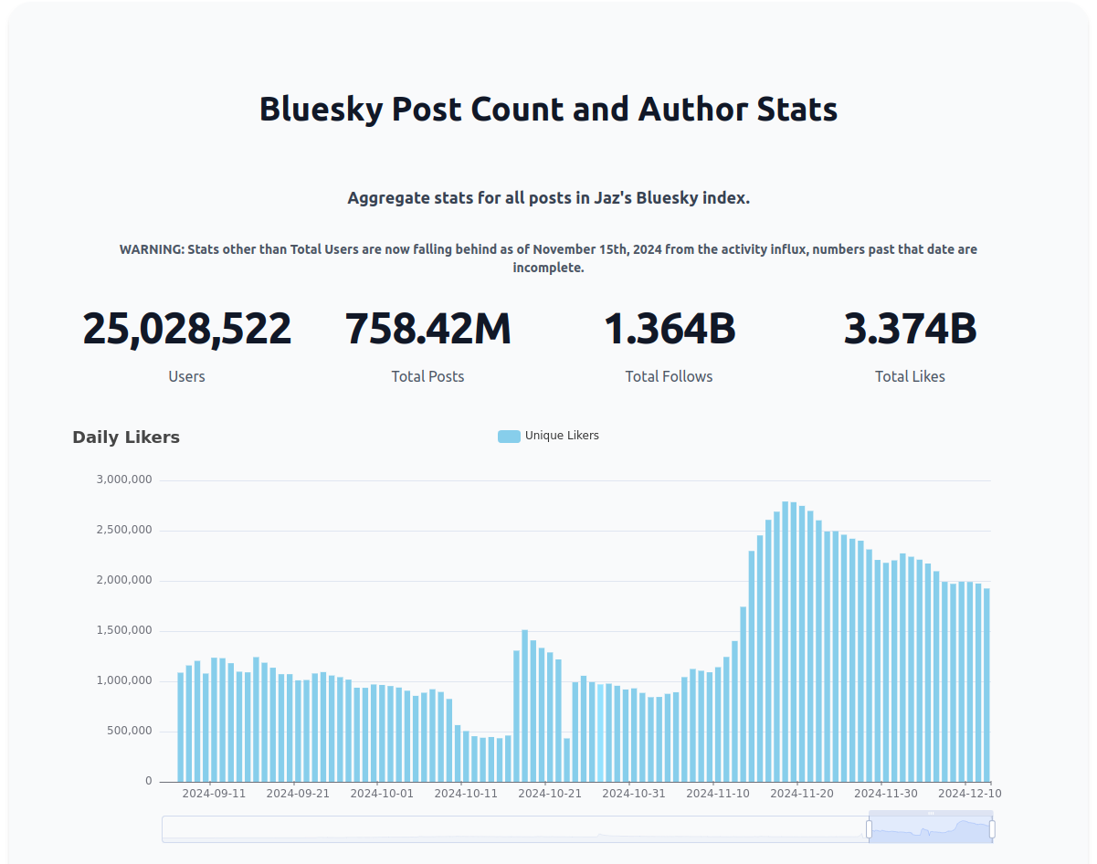 De ontwikkelaars waarschuwen dat data op het dashboard alleen accuraat is waar het gaat om het totaal aantal gebruikers. Andere gegevens, zoals het totale aantal posts, volgverzoeken en vind-ik-leuks zijn volgens de ontwikkelaars 'incompleet'. Desondanks laten ook die een enorme groei zien. Vergeleken met een maand eerder steeg het aantal posts op het platform van 560 miljoen naar 760 miljoen en verdubbelde het aantal volgverzoeken van 637 miljoen naar 1,3 miljard. Die cijfers waren een maand eerder echter ook al incompleet. Bluesky wijt dat aan 'de recente aanwas van gebruikers'.
