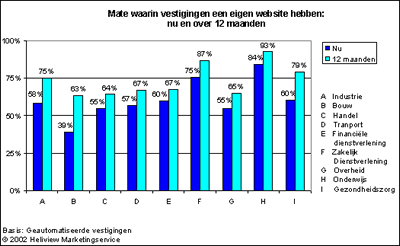 Eigen websites komen het meeste voor bij overheidsinstellingen. Maar liefst 84 procent van de vestigingen uit deze branche heeft een eigen pagina op Internet. Ook in de zakelijke dienstverlening komen eigen websites veelvuldig voor (bij 75 procent). In de bouw komt de eigen website het minst voor (slechts 39 procent). Laatst genoemde sector gaat overigens de komende 12 maanden wel een grote inhaalslag maken. Maar liefst 63 procent van de vestigingen in de bouw verwacht in 2003 een eigen website te hebben. Ook in de gezondheidszorg wordt een flinke groei verwacht van het aantal vestigingen met een eigen websites (van 60 procent naar 79 procent).