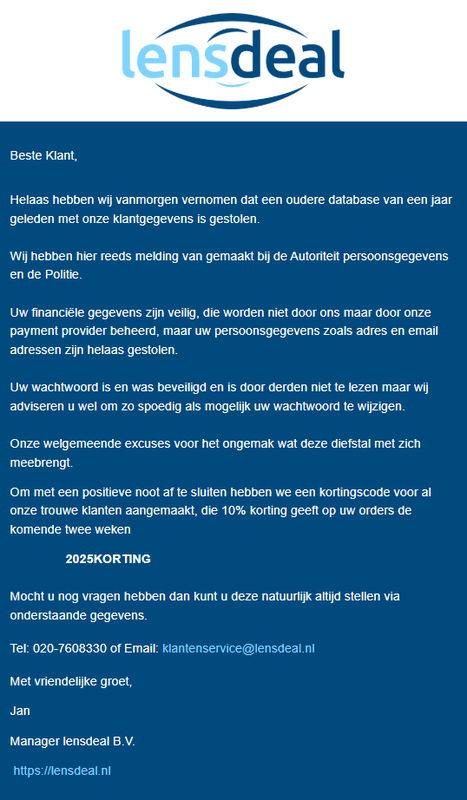Lensdeal.nl, een webwinkel voor contactlenzen en accessoires, waarschuwt klanten in een e-mail dat hun gegevens mogelijk zijn uitgelekt. Ook meerdere tweakers hebben die e-mail ontvangen. "Helaas hebben wij vernomen dat een oudere database van een jaar geleden met onze klantgegevens is gestolen", schrijft het bedrijf. Daarbij zijn in ieder geval 'adressen en e-mailadressen gestolen'. Om welke gegevens het precies gaat, schrijft Lensdeal niet, maar Cybercrime Info heeft een screenshot gemaakt van de gegevens die op Breach Forums worden aangeboden. Tweakers heeft de dataset zelf nog niet kunnen verifiëren.