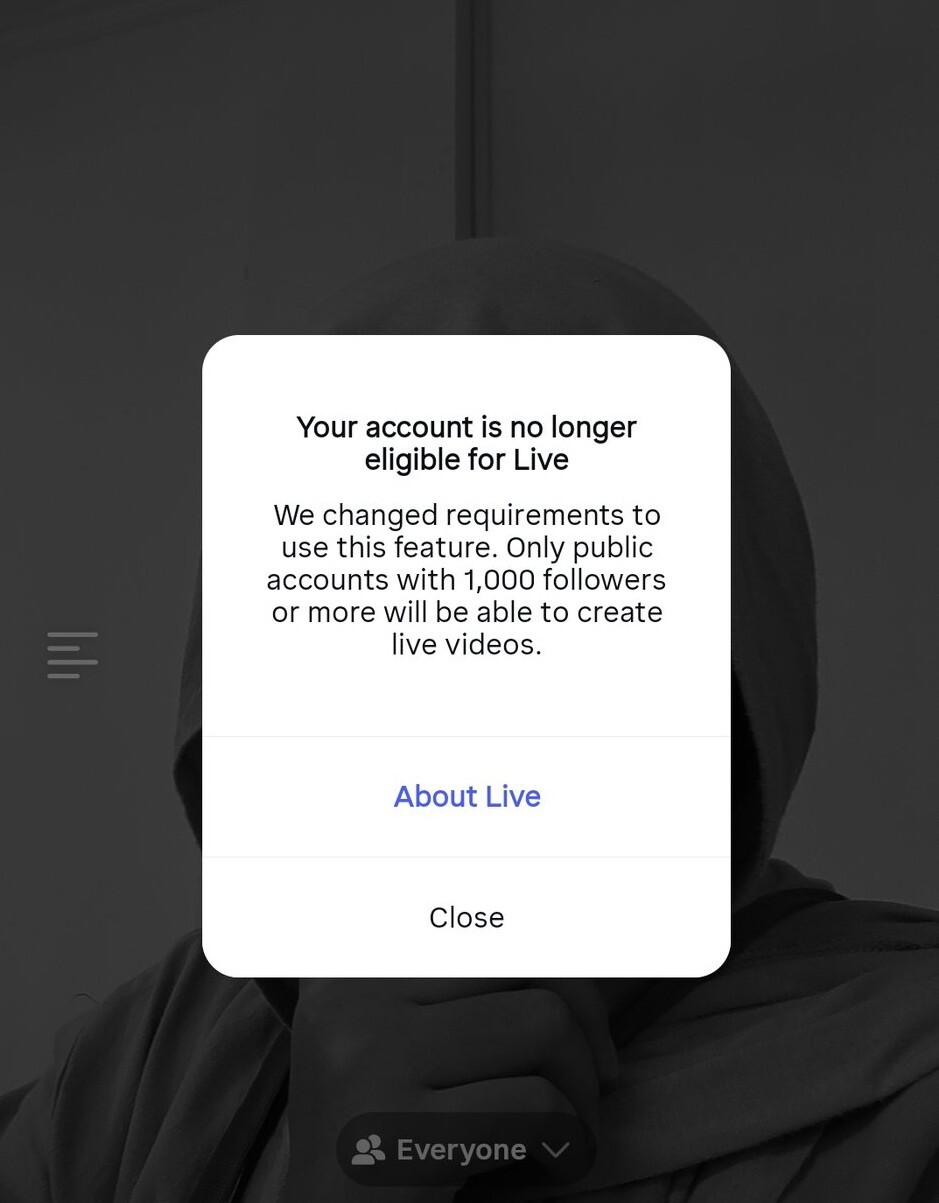 Als Instagram-gebruikers willen livestreamen, moet hun account in het vervolg openbaar staan en moeten ze minstens duizend volgers hebben, zegt een woordvoerder van het sociale medium tegen TechCrunch. Voorheen kon iedere gebruiker live, ook zonder volgers en met een privéaccount.
