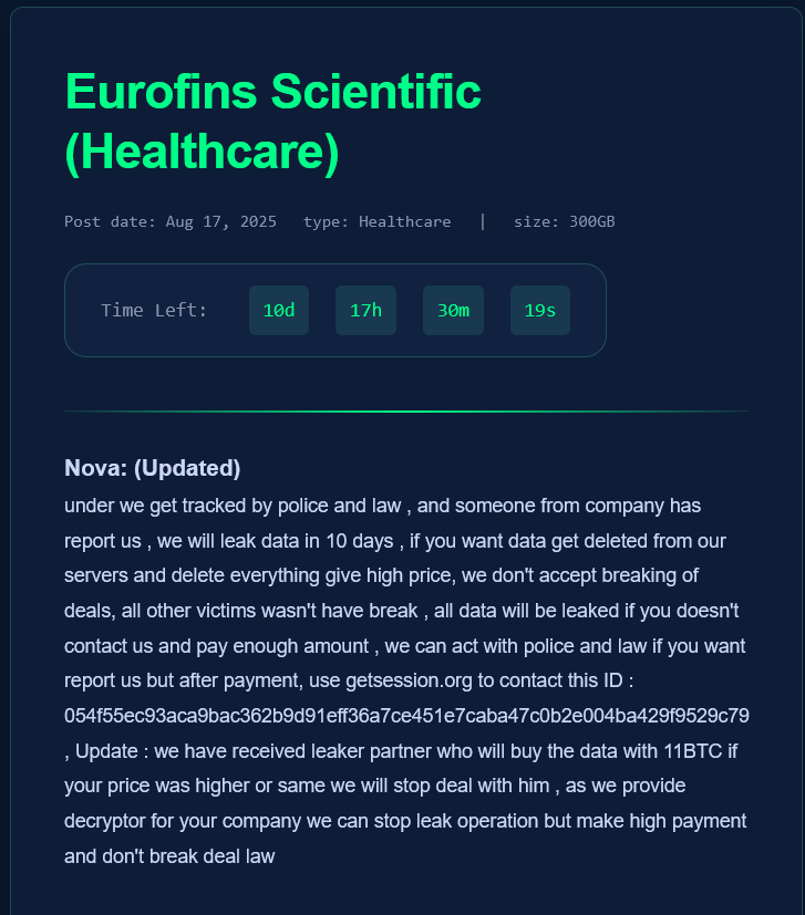 Nova laat op zijn website op het darkweb weten dat Eurofins Scientific, waar Clinical Diagnostics onderdeel van uitmaakt, een 'afspraak' heeft geschonden, al wordt uit de boodschap niet geheel duidelijk om welke afspraak het gaat. De bende geeft wel aan dat iemand van het laboratorium de ransomwareaanval bij de politie heeft gemeld.