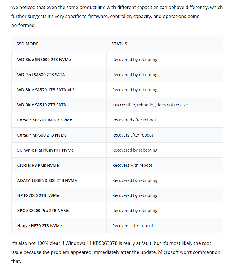 Ssd-modellen die zouden zijn getroffen, zijn onder andere de Corsair Force MP600, de SanDisk Extreme PRO M.2 NVMe 3D, de Kioxia Exceria Plus G4, de Fikwot FN955, plus ssd's met de PS5012-E12-controller van Phison en ssd's met een controller van InnoGrit. Technieuwssite Neowin meldde eerder dat mogelijk ook harde schijven (hdd's) worden geraakt. Het probleem lijkt dus niet verbonden aan een specifieke ssd-fabrikant of -controller, hoewel onduidelijk is hoe wijdverspreid het probleem precies is. Microsoft noemt dit mogelijke probleem met KB5063878 niet in zijn lijst van 'bekende problemen' voor die update.