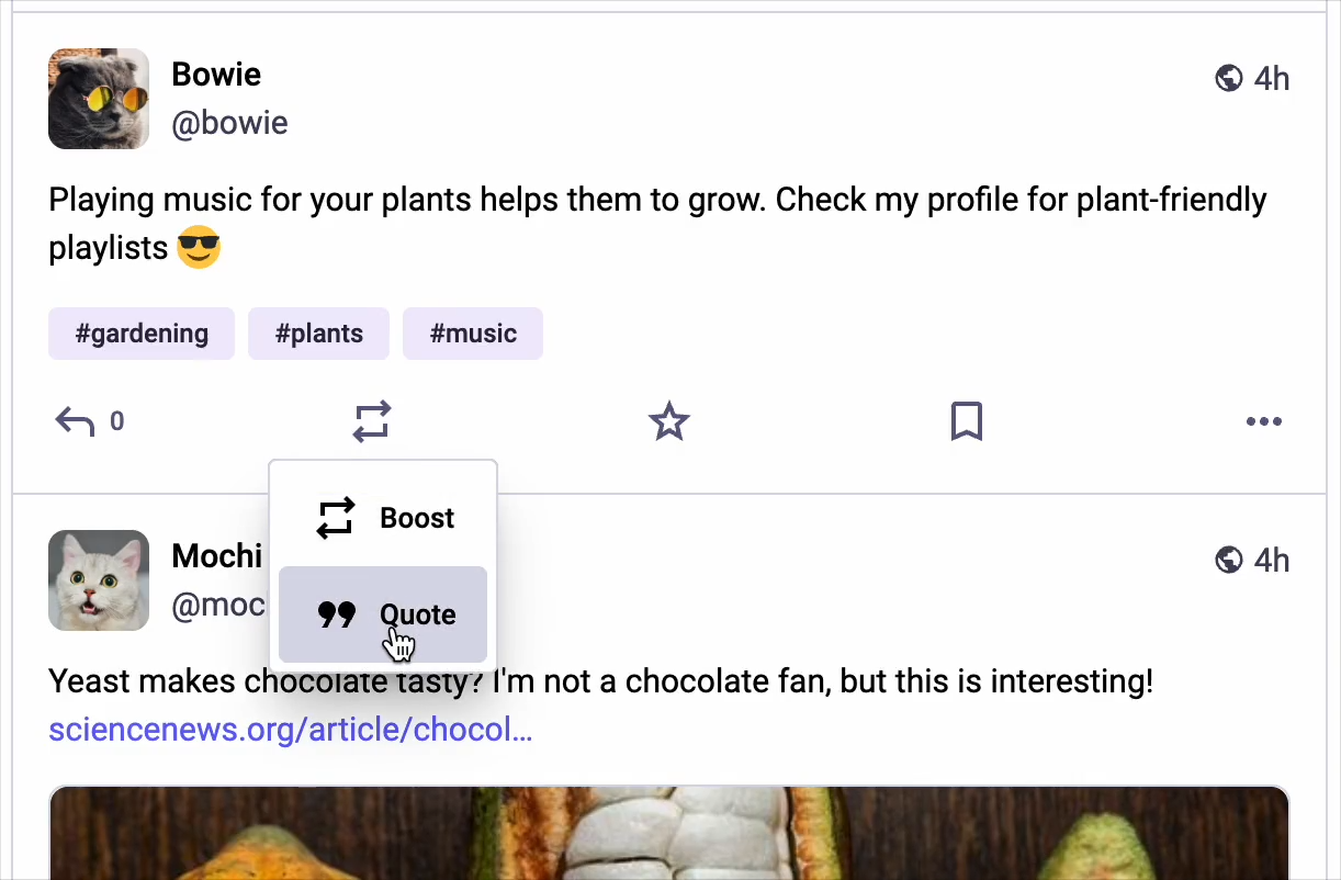De optie om andere posts te citeren is te vinden onder de Boost-knop, schrijft Mastodon. Wanneer gebruikers daarop klikken, verschijnt het bericht in een opstelvenster. Daar kunnen zij hun eigen commentaar aan de geciteerde post toevoegen en dit als nieuw bericht plaatsen. De dienst kondigde de functie in juli al aan.