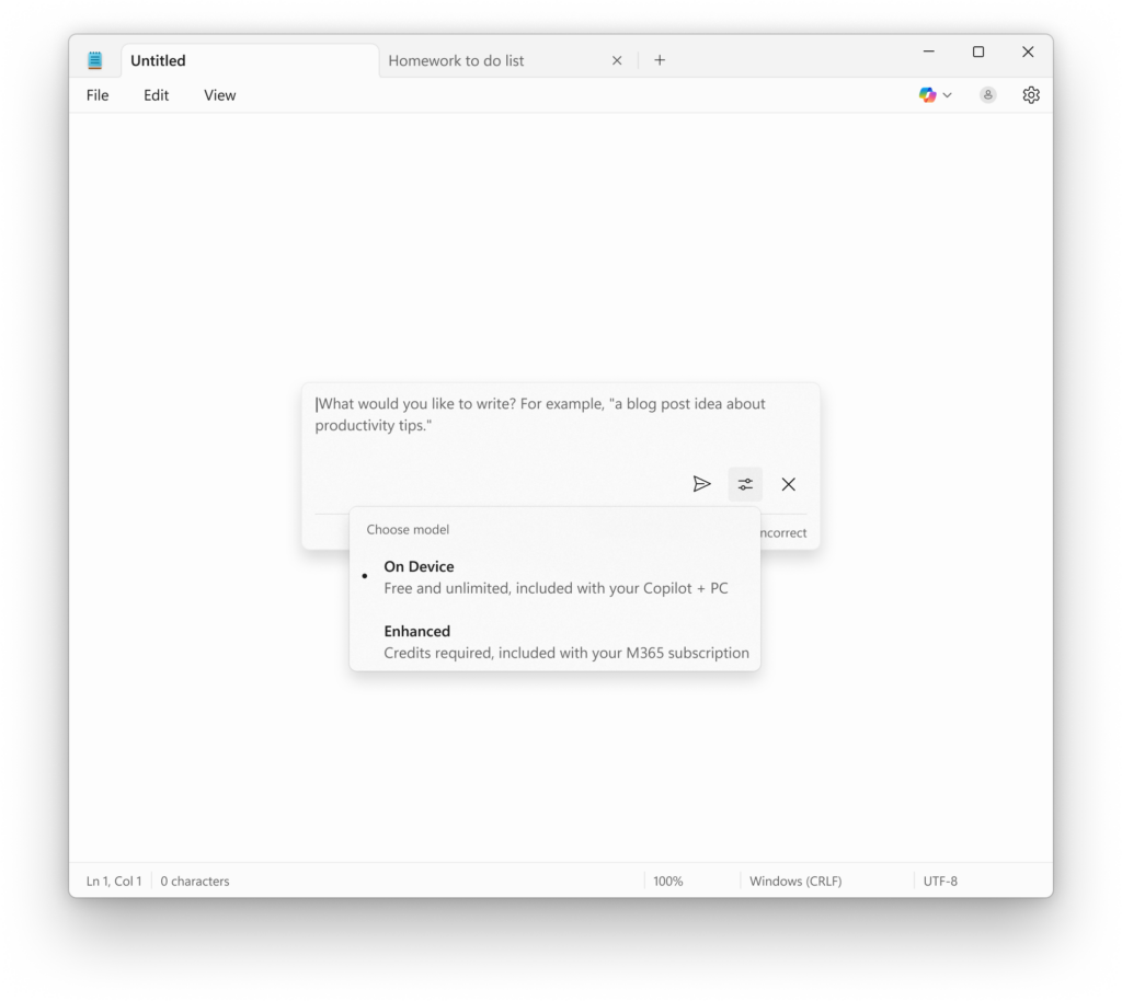 De AI-functies van Windows Kladblok gaan in de toekomst op machines met Copilot+ niet langer een abonnement vereisen. Dat is nu nog wel zo. In plaats daarvan gaan de AI-functies om teksten samen te vatten of te herschrijven lokaal op de machine draaien.