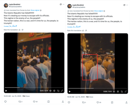 De onderzoekers hebben zich vooral gericht op de accounts nadat Israël op 13 juni een grote militaire aanval lanceerde tegen Iran. Sindsdien begonnen de aan het Prisonbreak-netwerk gelieerde X-accounts video's en foto's te verspreiden over de onrust en protesten in Iran. Er zijn aanwijzingen dat meerdere van deze video's AI-gegenereerd zijn. Bij een van de video's, die toont hoe lange rijen mensen bij de bank wachten en in opstand komen, vervaagt en vervormt bijvoorbeeld een van de lichamen.