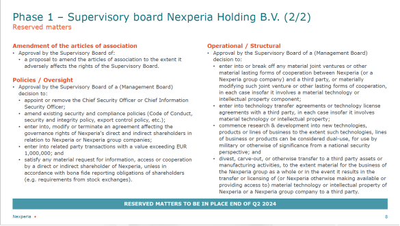 Nexperia wilde daarom erkend worden als Nederlands en Europees bedrijf en zo afkomen van die negatieve perceptie en mogelijke handelsbeperkingen. Sinds vorig jaar was het bedrijf in overleg met het ministerie over 'bepaalde herzieningen in het bestuur', die daarbij moesten helpen. Het chipbedrijf had daarvoor verschillende toezeggingen gedaan. Er zou een westerse minderheidsaandeelhouder aan boord komen, waarna Nexperia op termijn naar de beurs zou gaan. Er zou ook een raad van commissarissen komen, die toezicht zou houden op de Nederlandse Nexperia Holding-onderneming.