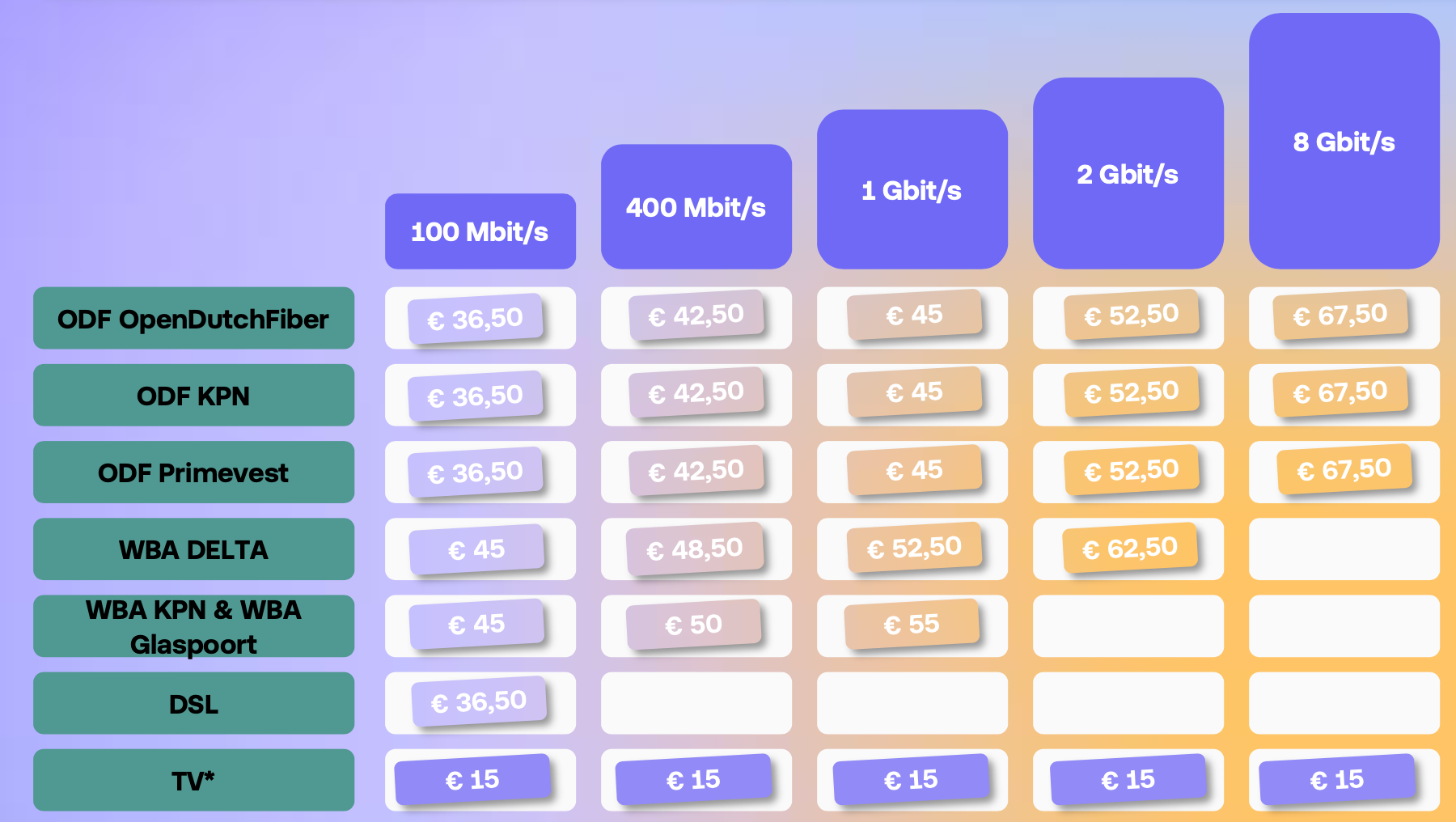 | Glasvezel 100 | € 36,50 | € +1,50 | € 45,00 | Ongewijzigd |