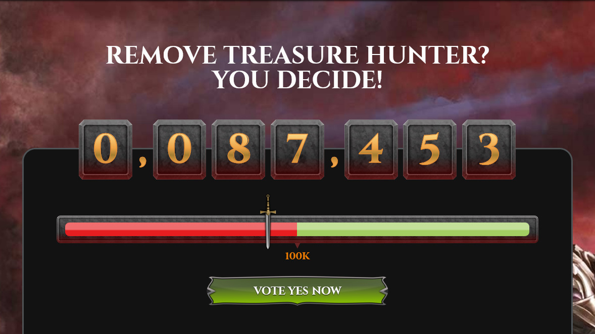 Spelers kunnen vanaf nu stemmen op de RuneScape-website en hebben daarvoor tot 12 november de tijd. De peiling heeft alleen de mogelijkheid om 'Ja' te stemmen. Als 100.000 verschillende spelers dat doen, wordt Treasure Hunter uit RuneScape 3 gehaald, zo bevestigt ontwikkelaar Jagex. Op het moment van schrijven hebben meer dan 87.000 spelers een stem uitgebracht.