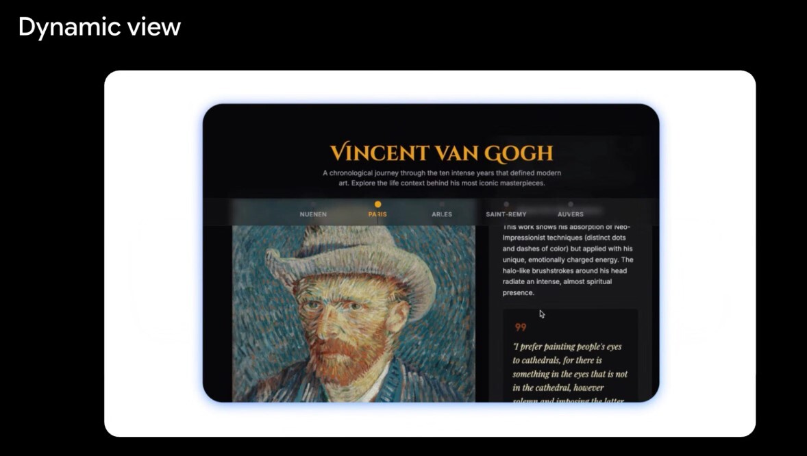 De modus met het maken van interactieve webpagina's heet Dynamic View, zegt Google. Het bedenkt en programmeert op basis van de prompt een interactieve webpagina met eigen knoppen en interface-elementen die de informatie beter moet overbrengen dan statische tekst. Ook komt er iets dat Visual Layout heet, waarbij de AI-app probeert een antwoord weer te geven als artikel uit een magazine met foto's en tijdlijnen. Een voorbeeld dat Google gebruikte is een calculator voor hypotheeklasten op basis van diverse rentepercentages.