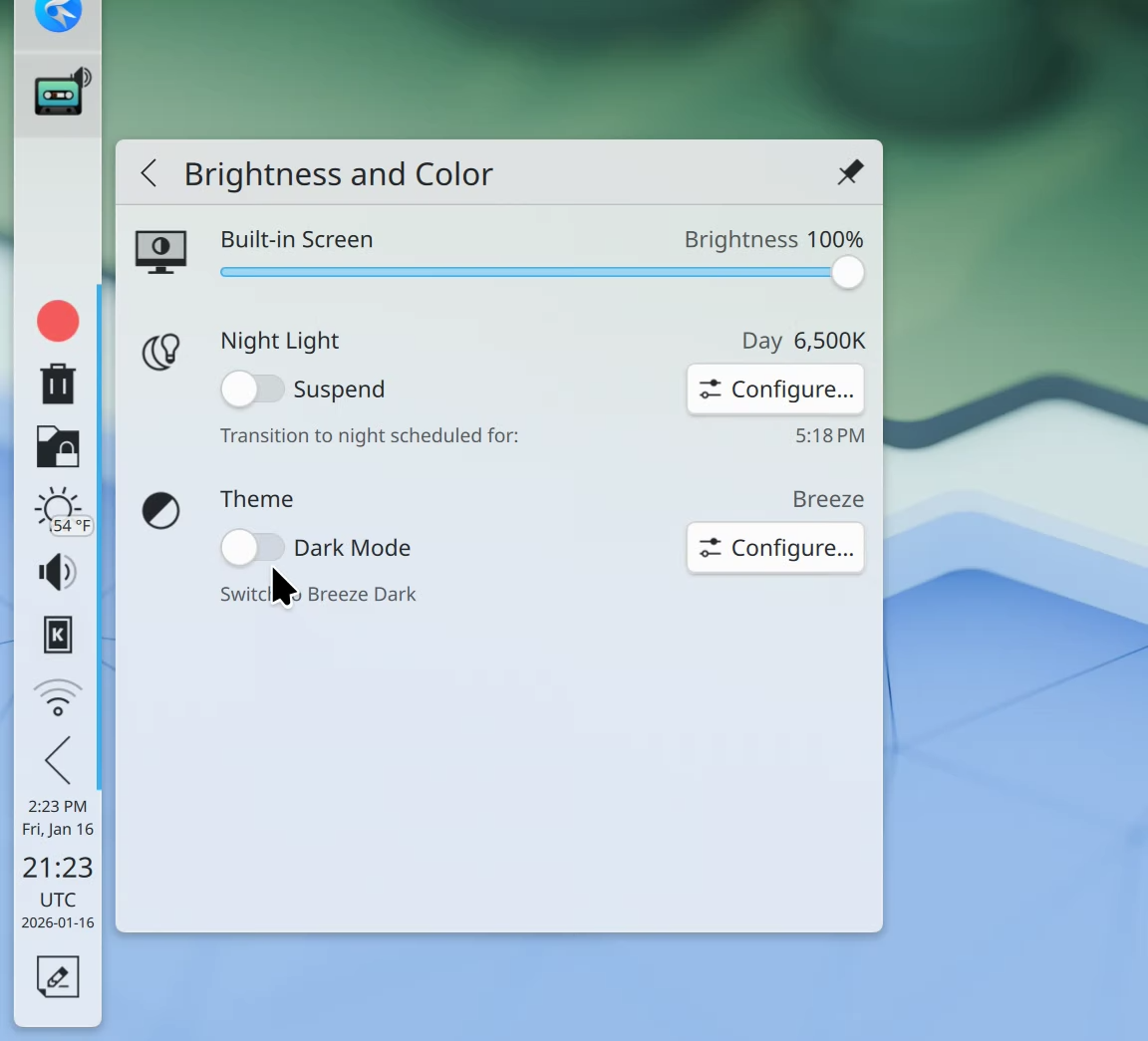 Daarnaast hebben de ontwikkelaars in versie 6.7 een schakelaar toegevoegd om snel naar de donkere modus te schakelen. Deze is te vinden in de widget met helderheids- en kleurinstellingen. De ontwikkelaars moeten nog een animatie toevoegen om de overgang soepel te doen ogen. Het is nog niet bekend wanneer versie 6.7 beschikbaar komt. Op dit moment is KDE Plasma versie 6.6 in bèta en die komt uit op 17 februari.