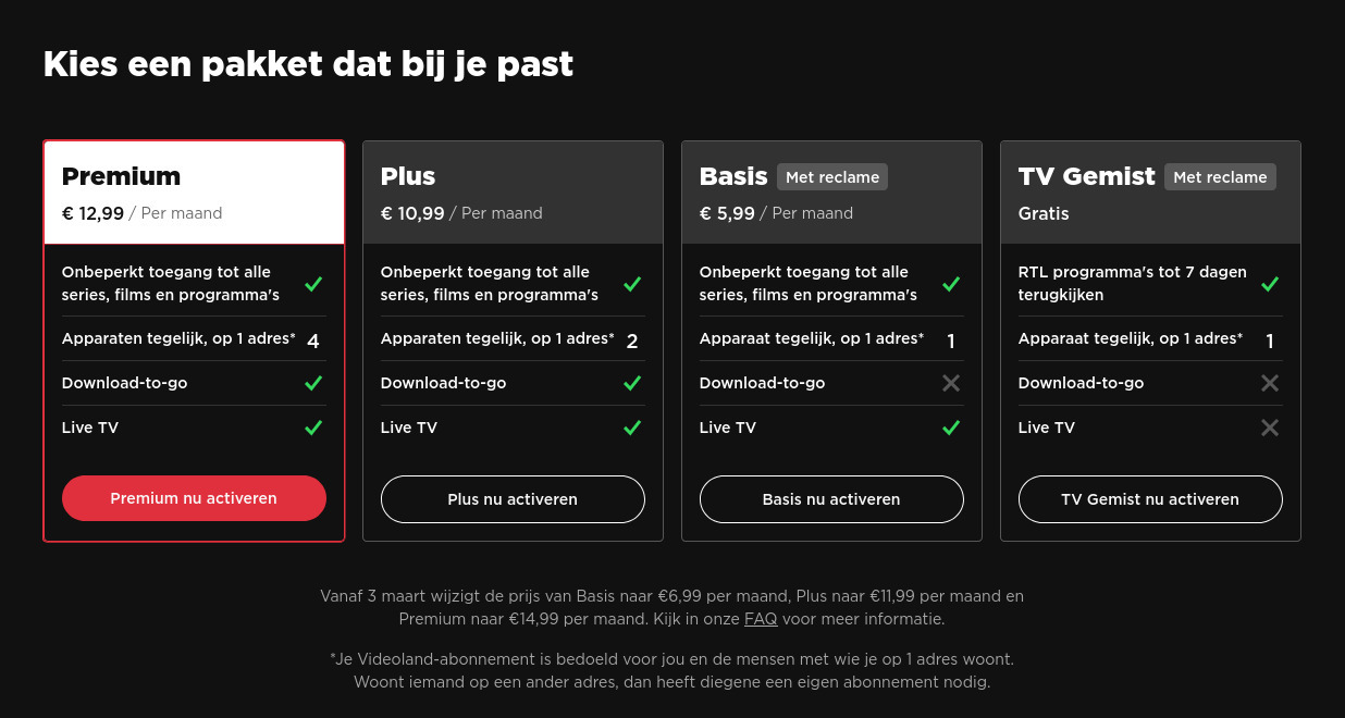 | Videoland Basis | 5,99 euro p.m. | 6,99 euro p.m. | 16,7 procent |