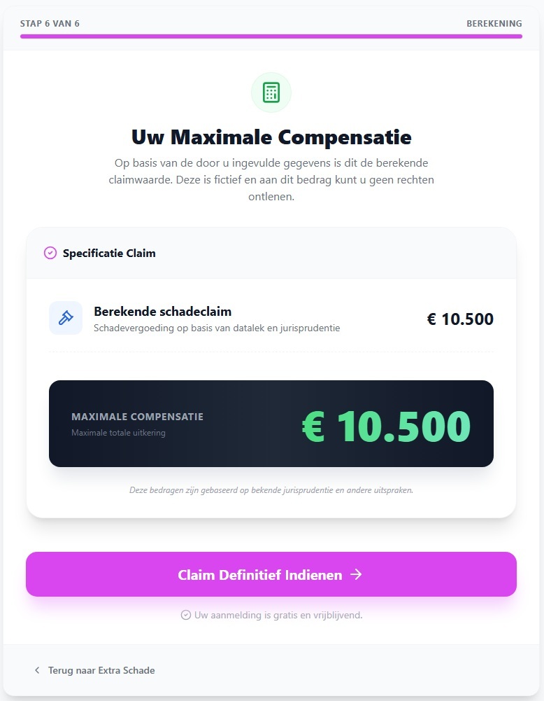 Desondanks kunnen slachtoffers volgens de scamsite 'tot meer dan 1500 euro' krijgen, wat bij het invullen van de claim kan oplopen tot ruim 10.000 euro. Al zegt de site hierbij wel dat het bedrag fictief is. De site staat dus niet volledig vol met leugens, alleen voor 99 procent. Verder staan er verschillende 'rode vlaggen' op de site. Zo wordt er niet gezegd met welke advocatenkantoren er wordt samengewerkt, wordt er geen KvK-nummer genoemd en is het genoemde adres een flexwerkkantoor in Eindhoven.