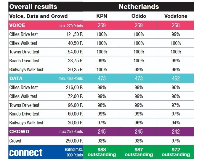 Alle drie de Nederlandse providers doen het al jaren uitmuntend in de benchmark, meldt umlaut. KPN kwam dit jaar uit 988 punten, een puntje minder dan de score van 989 punten vorig jaar. Odido komt afgerond uit op 987 punten en Vodafone zit vlak daarachter met 972 punten. In vergelijking met andere landen zijn de scores heel hoog.