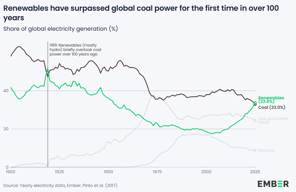 In 2025 werd er voor het eerst in de geschiedenis van het moderne stroomnet wereldwijd meer elektriciteit uit hernieuwbare bronnen opgewekt dan uit steenkool. Zonne-, wind- en waterkrachtenergie waren goed voor 33,8 procent van de wereldwijde stroom, ofwel 10.730TWh.
