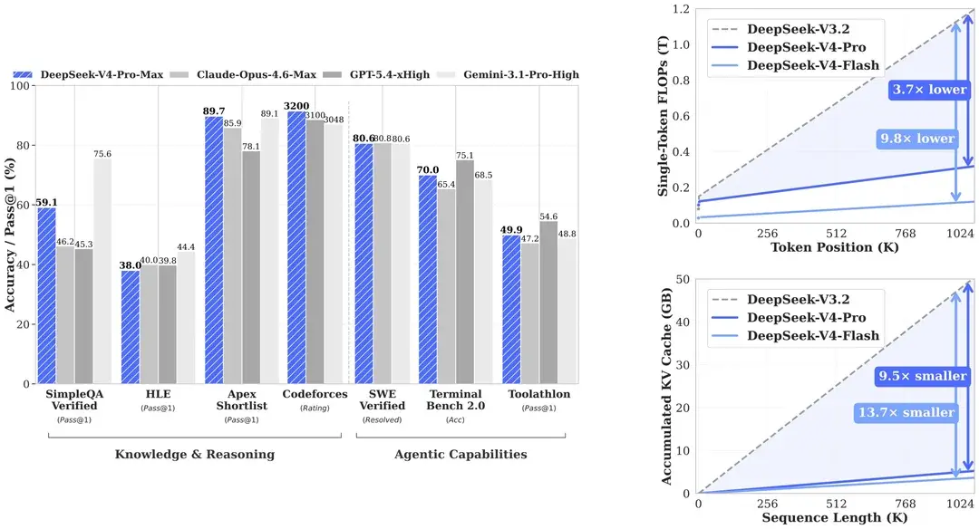DeepSeek claimt dat V4-pro op het gebied van wereldkennis, redeneren, programmeren en agentische taken significant beter scoort dan zijn V3-modellen. Ook zou het model in veel benchmarks, zoals SimpleQA en Codeforces, beter presteren dan concurrerende modellen als GPT-5.4 en Claude Opus 4.6, hoewel Gemini 3.1 Pro High meestal hogere scores behaalt. Net als de andere llm's van DeepSeek maken de V4-modellen gebruik van het 'open weight'-principe, wat betekent dat de parameters van de modellen door gebruikers aangepast mogen worden. De llm's zelf worden onder een MIT-opensourcelicentie ontwikkeld.