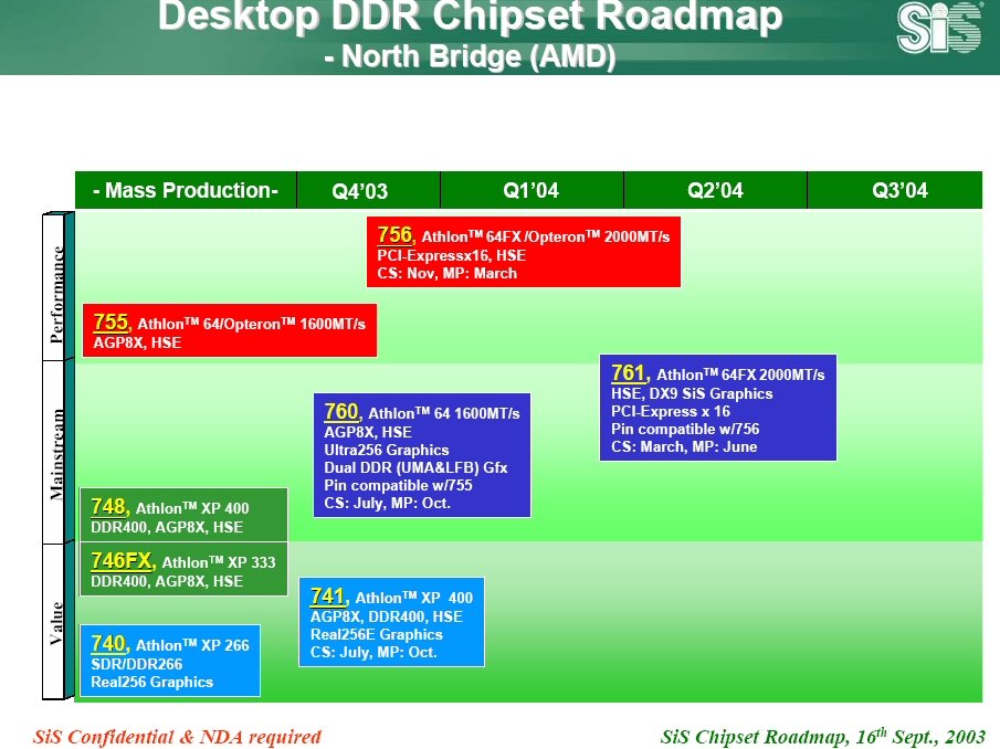 De AMD-roadmap is minder uitgebreid, hoewel er wel een aantal interessante chipsets op staan. Uit de roadmap valt af te leiden dat AMD de HyperTransport-bus volgend jaar opvoert naar 1000MHz. De SiS756 ondersteunt Socket 754 Athlon 64-processors, de SiS761 voegt daar nog eens ondersteuning voor de Socket 939-versie aan toe. Deze chipset bevat een onbekende DirectX9-GPU, die ook al in de eerder genoemde SiS662 terug te vinden is.