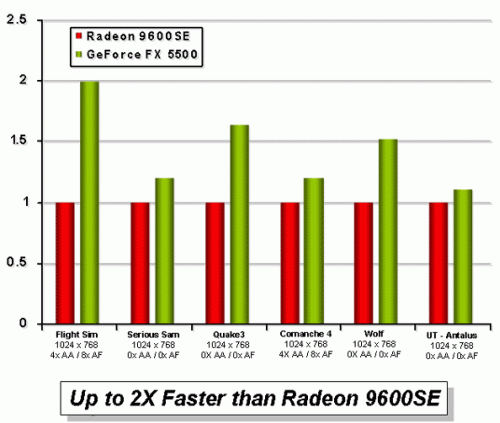 De Chinese website Hardspell.com heeft wat meer informatie over de GeForce FX 5500 weten te bemachtigen. Deze nieuwe GPU van nVidia zou gebaseerd zijn op de 5700 maar is uitgerust met langzamer geheugen en ook de core is langzamer geklokt. Het is de bedoeling dat de GeForce FX 5500 het gaan opnemen tegen de ATi Radeon 9600 SE. Volgens een dia die op Hardspell.com staat afgebeeld zou dit geen probleem moeten zijn, want de nieuwe GPU zou tussen de 10% en de 100% sneller zijn dan de 9600 SE van ATi.