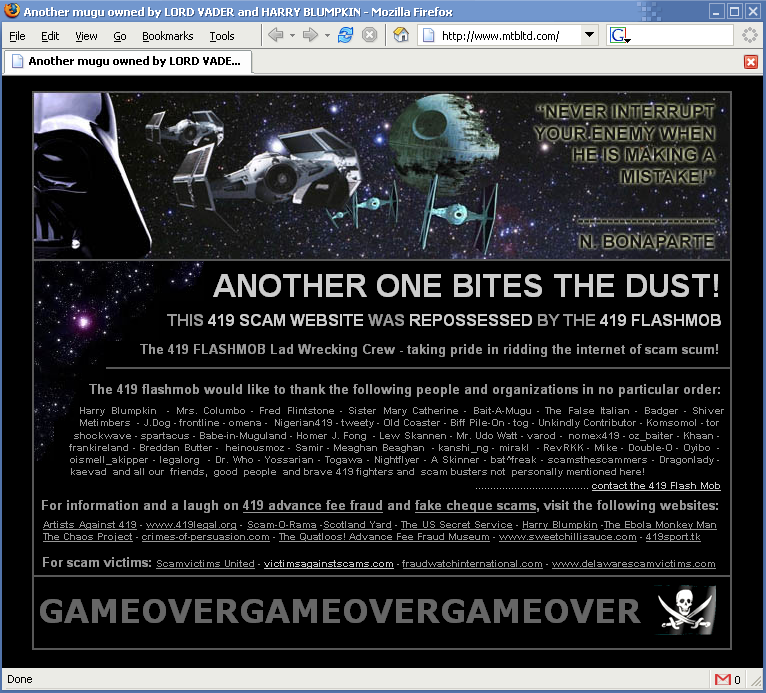 Niet alleen de onschuldige computergebruiker heeft te duchten van criminelen. Het beveiligingsbedrijf Netcraft heeft meldingen binnengekregen van zogenaamde 'defacements' van phishingsites. Tot voor kort hield een defacement in dat een website werd voorzien van politieke leuzen of een ode aan een of meerdere bekende of beruchte personen. Echter, aan de phishingwebsites die Netcraft tegenkwam waren door de hackers waarschuwingen toegevoegd die nietsvermoedende gebruikers erop wezen dat de website niet origineel was. Het bedrijf verwacht dat, naar mate er meer frauduleuze websites verschijnen, deze vorm van digitale graffiti zal toenemen. Hoewel het illegaal is, zal de overheid zeer waarschijnlijk niet snel acties ondernemen tegen deze vorm van cybercriminaliteit. De politie kan zelf beslissen welke zaken ze onderzoekt en fraudeurs helpen hun werk beter te kunnen doen zal geen hoge proriteit hebben.
