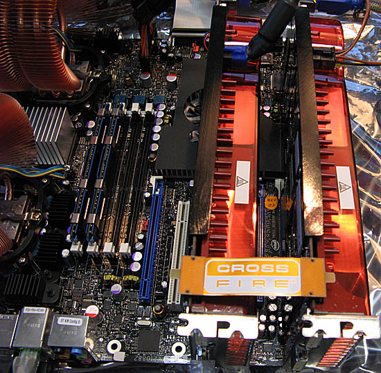 De LGA771-sockets van Skulltrail bieden verder plaats aan twee Core 2 Extreme-quadcores of twee Xeon-modellen en ondersteuning voor 1600MHz-fsb is aanwezig. Een van de meest interessante mogelijkheden van het moederbord is dat de vier pci-express x16-slots ingezet kunnen worden voor zowel een Crossfire-opstelling van ATI-videokaarten als een sli-opstelling van Nvidia-kaarten.