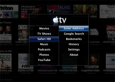 Een hacker heeft een applicatie geschreven die het mogelijk maakt om via Apple TV op de televisie te surfen. De muiswijzer kan in 'Safari HD' met de afstandbediening verplaatst worden.