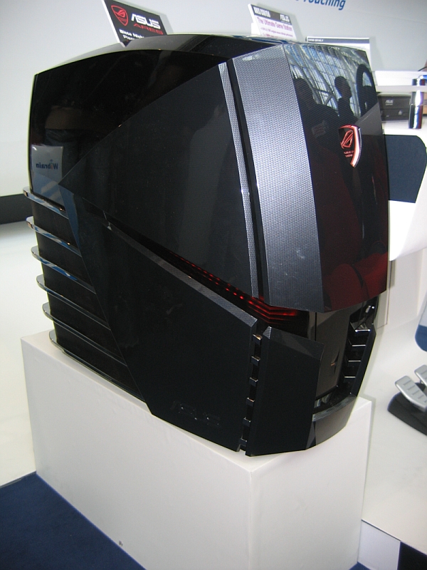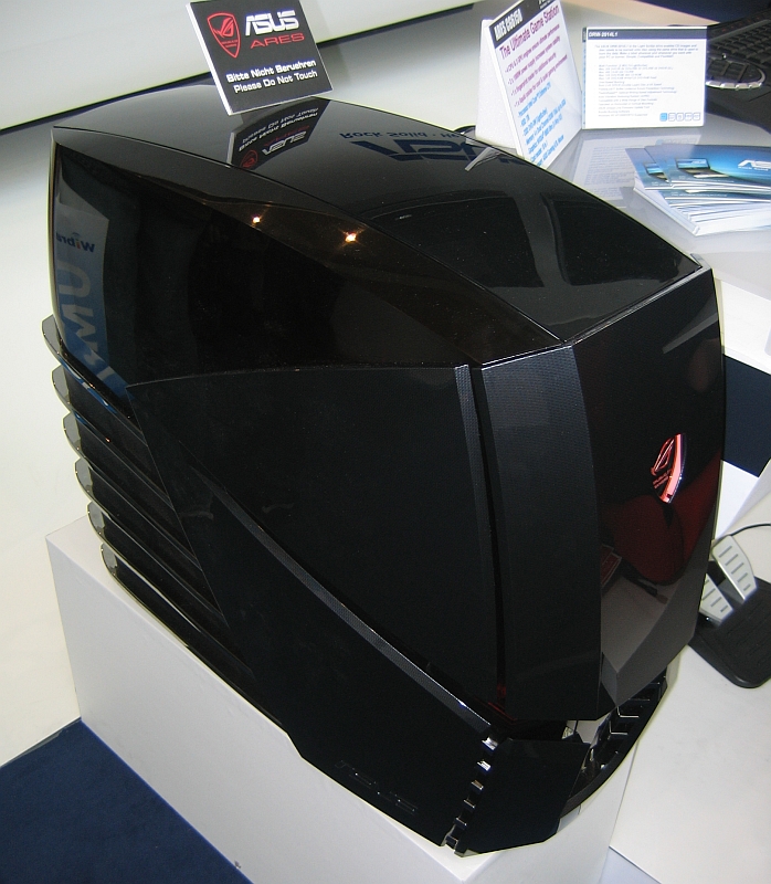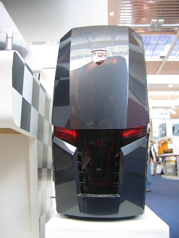 De twee gamemonsters zijn - bespeelbare - demonstratiemodellen op de stand van Asus. Onder de opvallende motorkap heeft het bedrijf de Intel Core 2 Extreme QX6850 geplaatst in combinatie met een Asus Maximum Extreme moederbord en drie Nvidia Geforce 8800 Ultra-kaarten in sli-opstelling. Het bedrijf heeft nog ruimte weten te vinden voor vier ddr2-reepjes van elk 2GB geheugen dat op 1066MHz loopt, evenals 1TB aan opslagruimte. Twee voedingen van beide duizend watt dienen voor voldoende prik te zorgen terwijl liquid cooling de temperatuur binnen de perken moet houden.