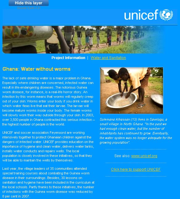 Google Earth Outreach, het initiatief van de zoekgigant voor maatschappelijke en goededoelenorganisaties, is voortaan ook voor Nederlandse instellingen beschikbaar. Unicef is de eerste organisatie die er gebruik van maakt.