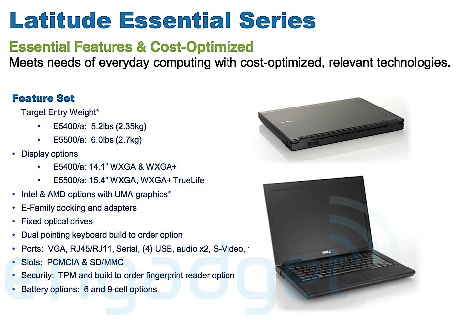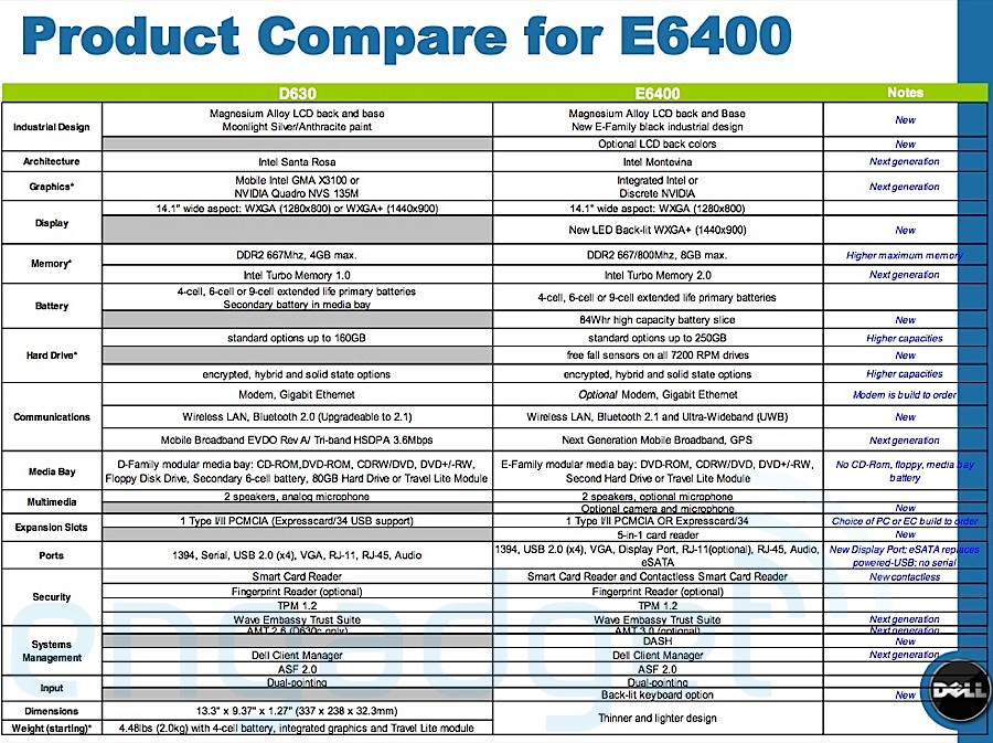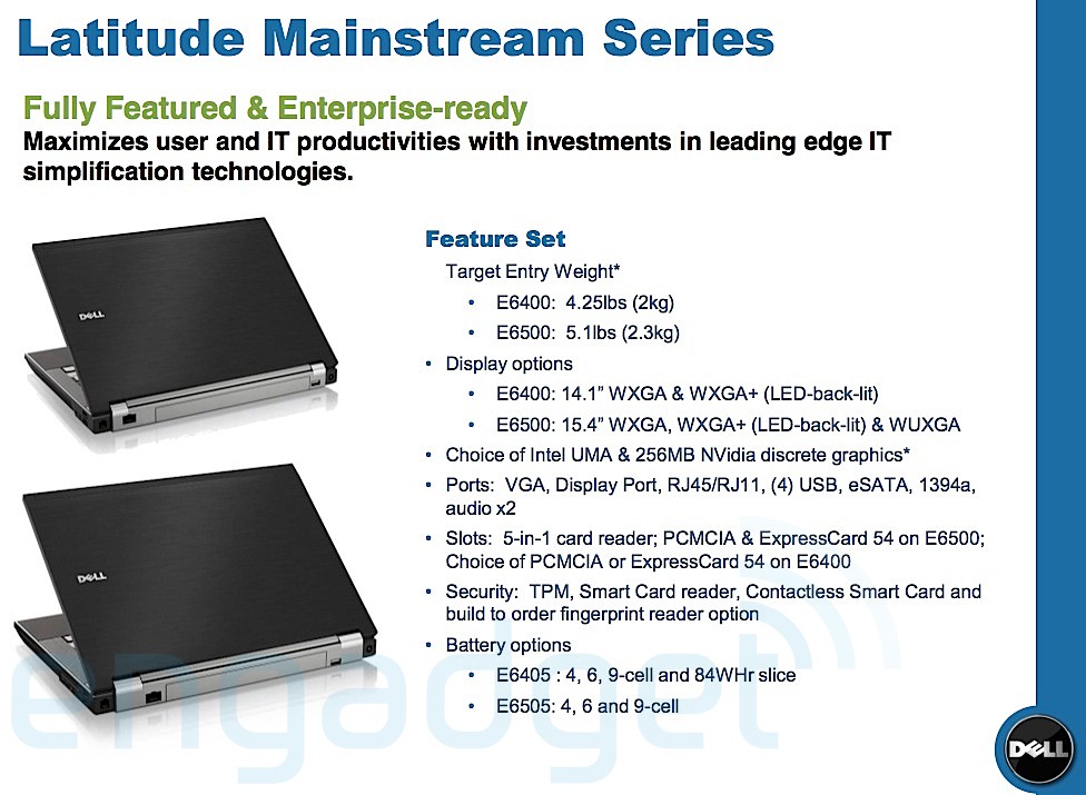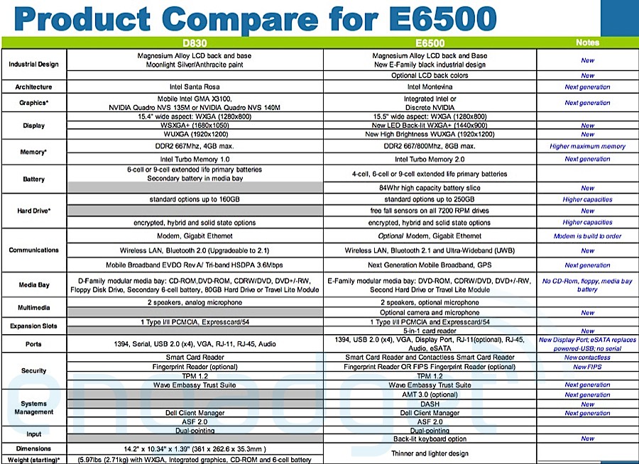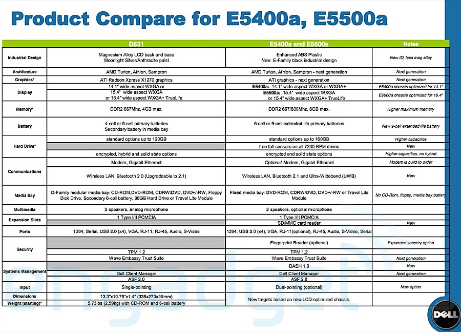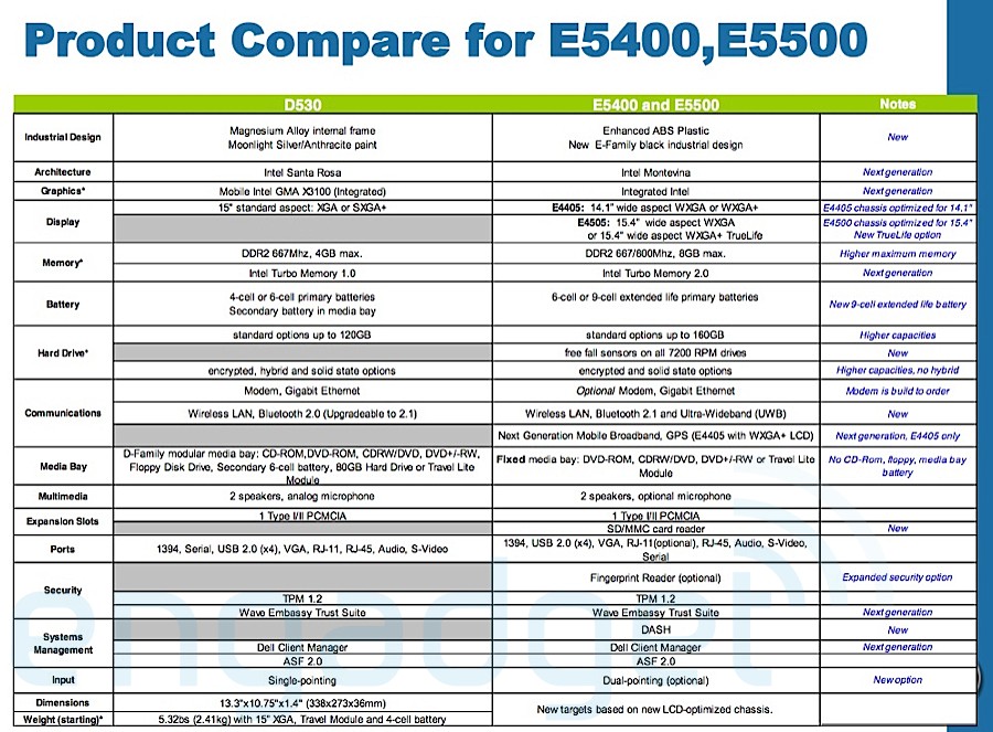 De nieuwe E6500 en E6400 moeten de huidige D830 en D630 vervangen. De twee notebooks zijn voorzien van respectievelijk een 15,4"- en een 14,1"-scherm. Ook de nieuwe E5500 en E5400 beschikken over respectievelijk een 15,4"- en een 14,1"-scherm en deze twee moeten de budgetmodellen D531 en D530 opvolgen. Volgens bronnen van Engadget moeten de nieuwe modellen in juni op de markt verschijnen. De E6500 en de E6400 zouden wel eens de eerste Montevina- of Centrino 2-machines van Dell kunnen worden. De E5500a- en E5400a-configuraties, die met AMD-chips zouden worden uitgerust, worden rond dezelfde tijd verwacht.