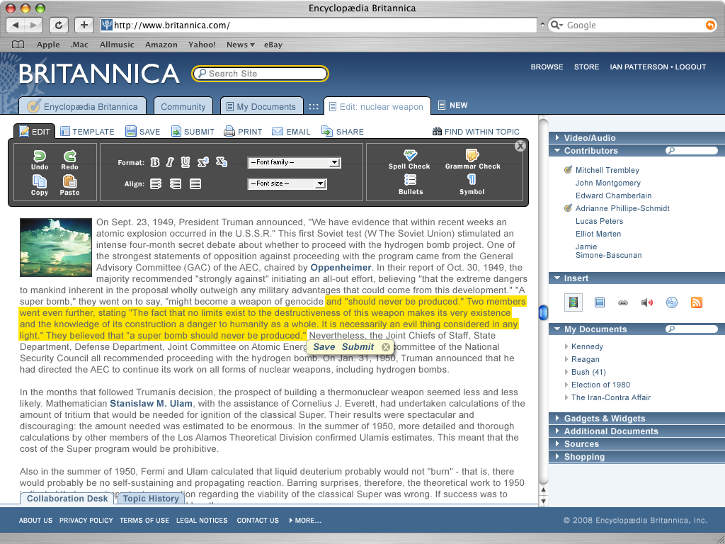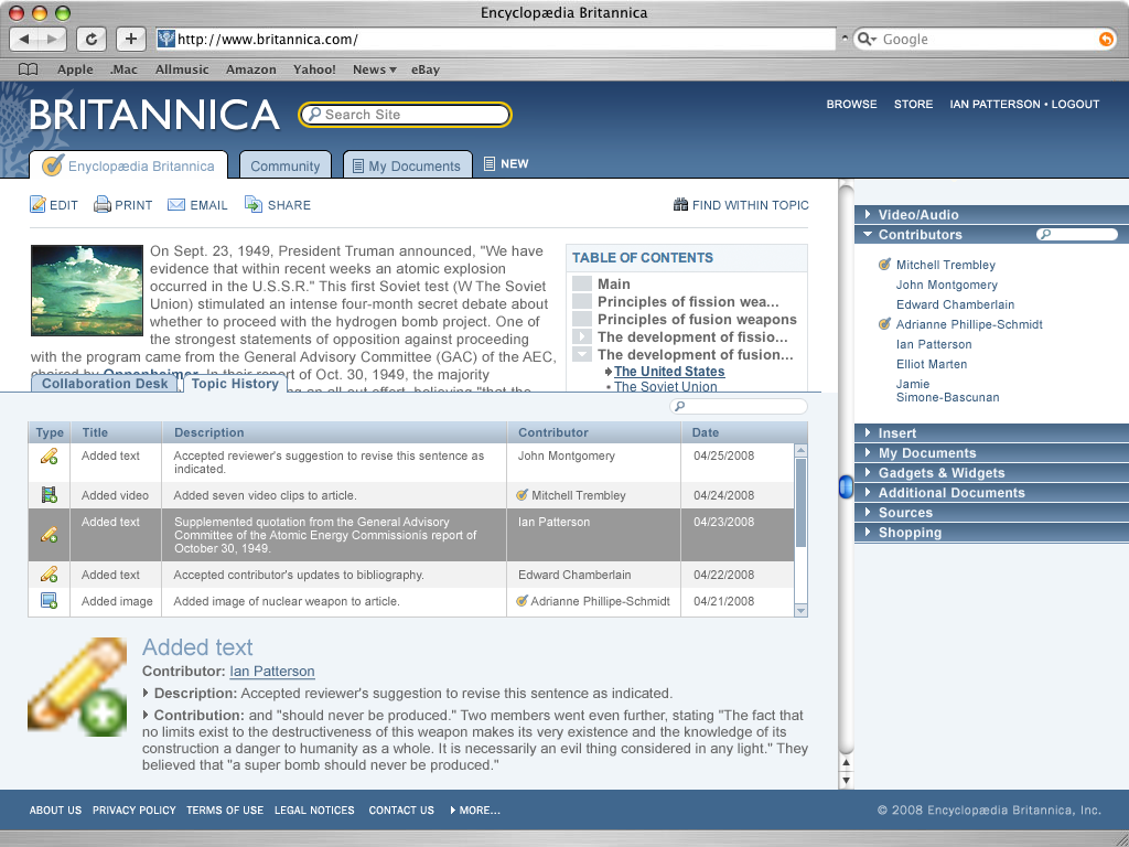 Encyclopaedia Britannica heeft aangekondigd dat het een stapje richting het Wikipedia-model zet met het toevoegen van door gebruikers aangeleverd materiaal. Dat wordt echter wel eerst gereviewd voordat het wordt opgenomen.