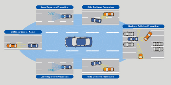 Om de kans op een aanrijding via de zijkant en achterkant van een auto te verkleinen, heeft Nissan twee nieuwe technieken ontwikkeld. Het side collision prevention-systeem houdt via sensoren die aan de zijkant van de auto zijn bevestigd, het verkeer op andere rijstroken in de gaten. Als de bestuurder bijvoorbeeld voor een inhaalactie naar de linker rijstrook wil manoeuvreren, en er bevindt zich op dat moment een medeweggebruiker in de blinde hoek van de auto, dan geeft de boordcomputer een akoestisch alarmsignaal af. Daarnaast probeert het systeem een ongeluk te voorkomen door tegen te sturen en het rempedaal te laten trillen. De chauffeur kan in geval van nood echter het systeem negeren en een forse stuurcorrectie toepassen.