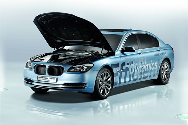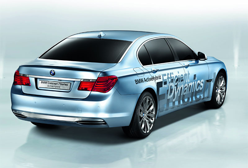 Autofabrikant BMW heeft zijn nieuwste hybride-auto Concept 7 Series getoond. De V8-benzinemotor wordt bijgestaan door een kleine elektrische motor die in de versnellingsbak is aangebracht.