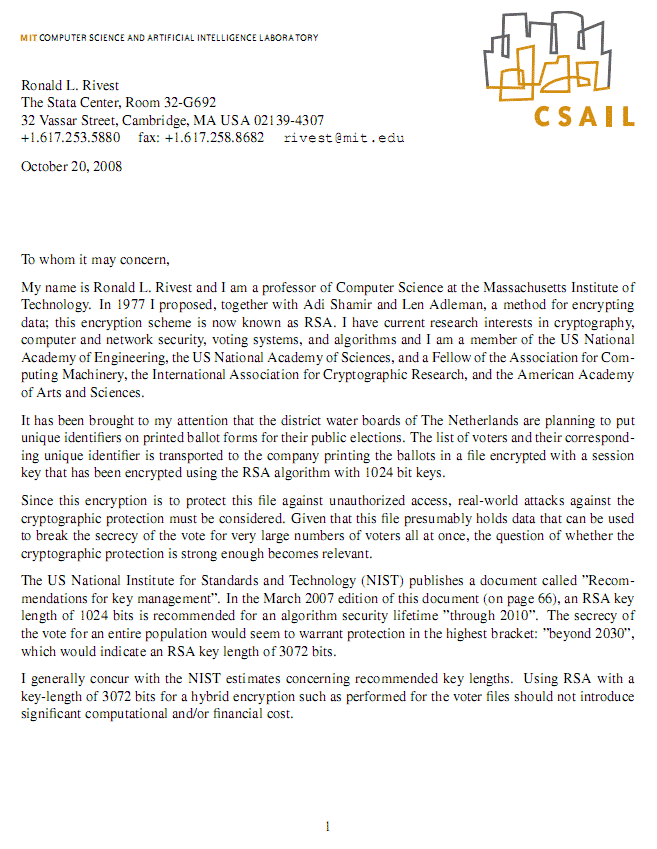 Stichting 'Wij vertrouwen stemcomputers niet' heeft bij de rechtbank een brief van Ron Rivest neergelegd. De encryptie-goeroe betoogt dat de waterschappen grote risico's nemen met de versleuteling van privacygevoelig materiaal.
