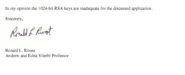 In het document stelt Rivest dat de door de waterschappen gebruikte sleutellengte van 1024 bits onvoldoende sterk is voor gevoelige overheidsinformatie. Bestanden met een dergelijke versleuteling zouden met de huidige ontwikkelingen in de chipindustrie praktisch gezien in 2010 kunnen worden gekraakt, zo waarschuwde het Amerikaanse Nist al in maart 2007. In mei van dat jaar werd deze bewering over rsa-1024 onderschreven door onderzoekers uit Duitsland, Japan en Zwitserland. Inmiddels raken bij veel bedrijven en overheidsinstellingen dan ook sleutels met een lengte van 2048 bits in zwang. Rivest onderschrijft de inschattingen over de noodzakelijke sleutellengtes voor 'zijn' encryptie-algoritme, en stelt dat bij privacygevoelige data - zoals de bestanden die voor de waterschapsverkiezingen worden gebruikt - een rsa-sleutellengte van 3072 bits gehanteerd zou moeten worden. Volgens inschattingen van experts zouden documenten die met deze sleutellengte worden versleuteld, tot 2030 veilig zijn.