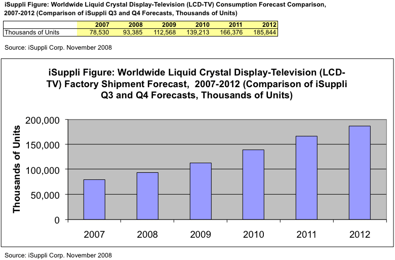 Volgens Isuppli zorgt de recessie in de VS en delen van Europa, samen met toenemende inflatiecijfers in opkomende markten, weliswaar voor een tragere groei, maar door een sterke vraag en felle prijsconcurrentie zou het effect meevallen. In het laatste kwartaal van 2008 en het eerste van 2009 zou door verminderde consumentenbestedingen de vraag tijdelijk wat terugzakken. Het marktonderzoeksbedrijf verwacht echter dat in het derde kwartaal van 2009 de vraag weer zal aantrekken, omdat de grote markten tegen die tijd de eerste tekenen van economisch herstel zouden laten zien.