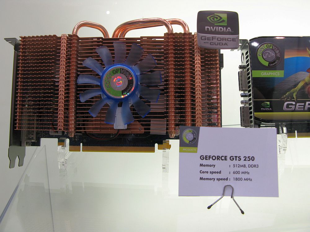 Nvidia heeft dinsdag op de Cebit de GTS250 officieel geïntroduceerd. De videokaart, die wordt uitgebracht in varianten met 512MB en 1GB, lijkt het prestatieniveau van de 'oude' 9800GTX+ praktisch te evenaren.